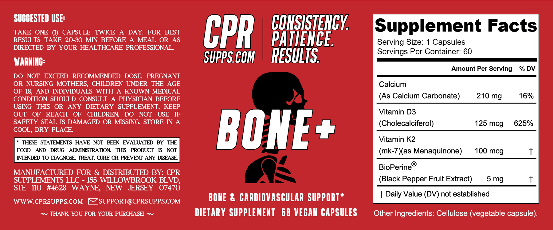 Ingredients: Calcium (as Calcium Carbonate), Vitamin D3 (Cholecalciferol), Vitamin K2 (mk-7)(as Menaquinone), BioPerine® (Black Pepper Fruit Extract), Cellulose (vegetable capsule).
